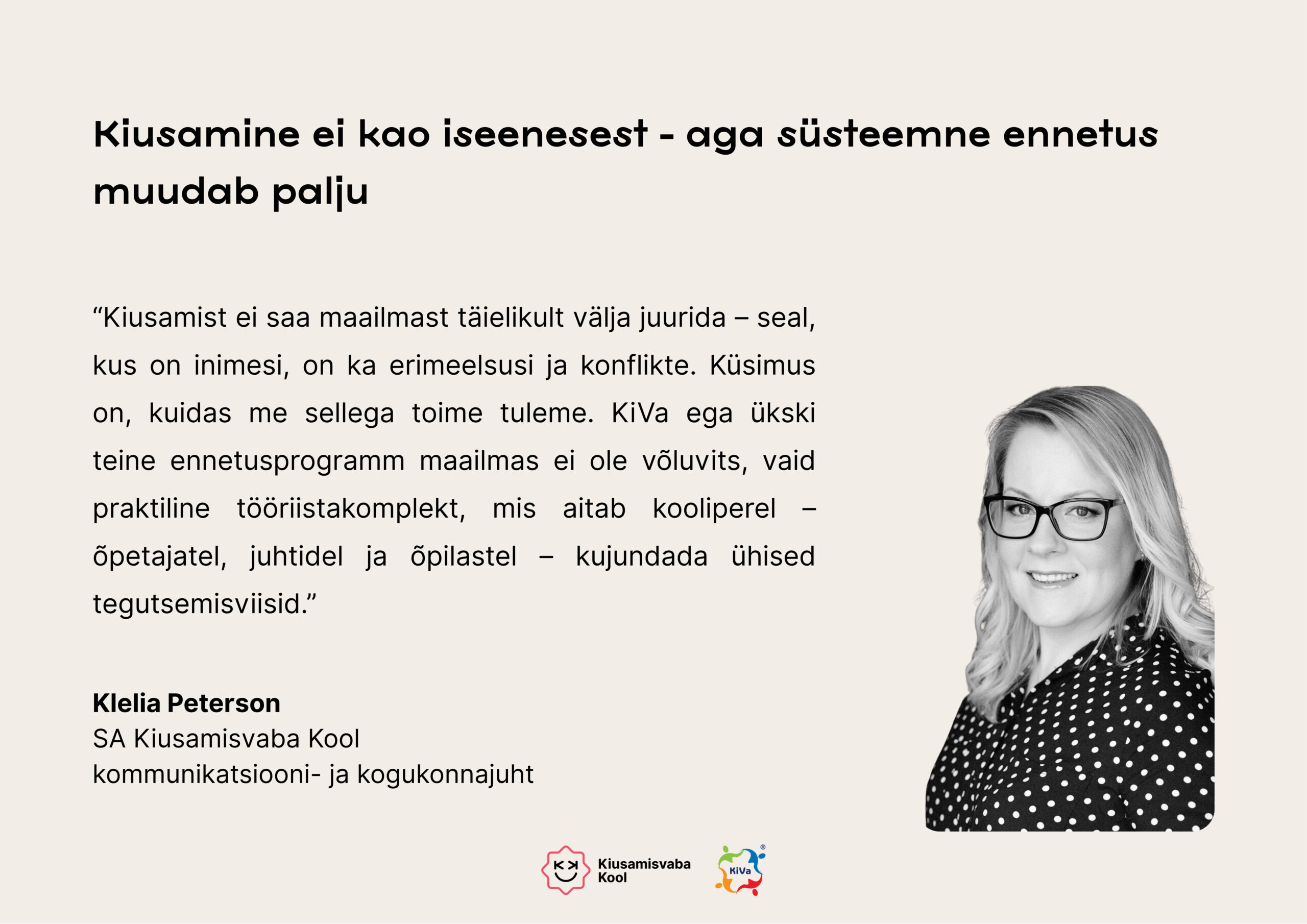 Seetõttu on just süsteemne ennetus – mitte üksikud loengud või kampaaniad – see, mis toob muutuse. Soomes Turu Ülikoolis välja töötatud KiVa programm, mida SA Kiusamisvaba Kool Eestis koolidele pakub, on üks sellistest terviklikest lahendustest. Programmi tõhusust on uuritud juba rohkem kui 15 aastat ja tulemustest on selgelt näha, et KiVa rakendavate koolide kiusamisnäitajad on järjepidevalt paremad, kui alles KiVaga alustavad koolid.